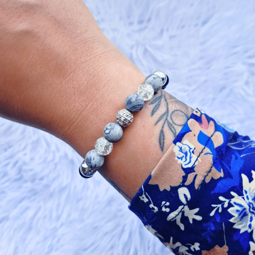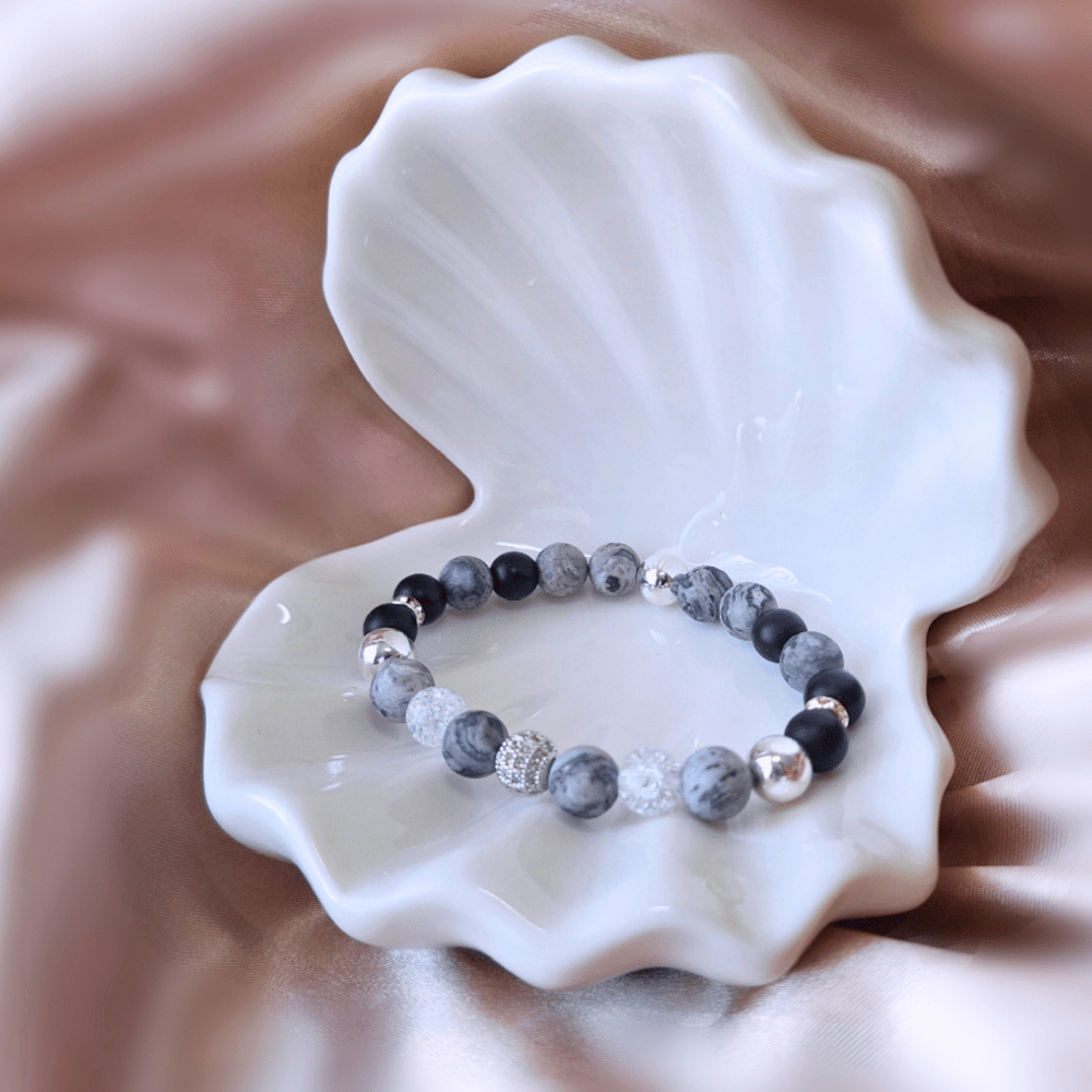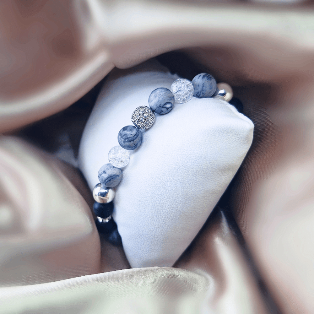 Jáspis – Hegyikristály – Ónix – Hematit karkötő cirkónia gömbbel